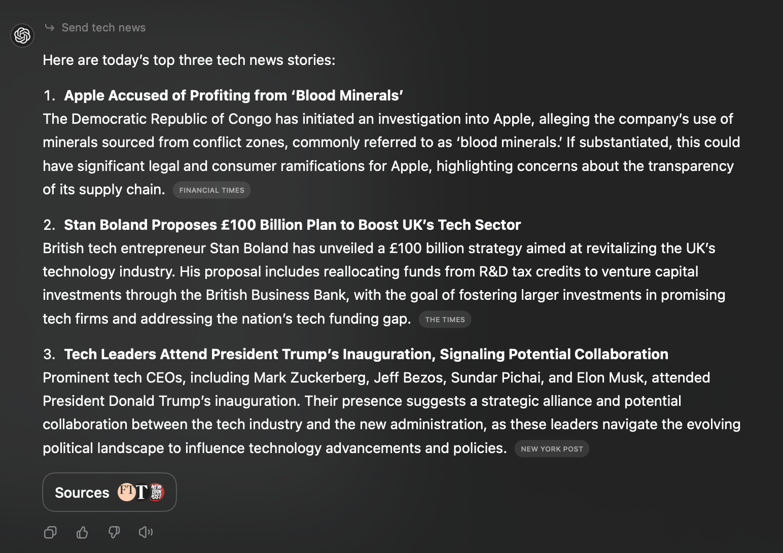 “Every weekday at 8:30 a.m., summarize the top three technology news stories, including links to the original articles.”