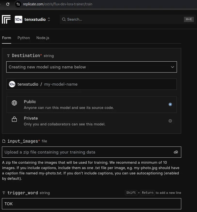 1import replicate4. Train your selected model using Replicate’s API: (flux-dev or flux-shnell)