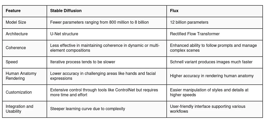 - Parameter Size: With 12 billion parameters, Flux is significantly larger than previous models like Stable Diffusion XL, which had around 3.5 billion parameters. This increase in parameters contributes to its enhanced performance and capabilities